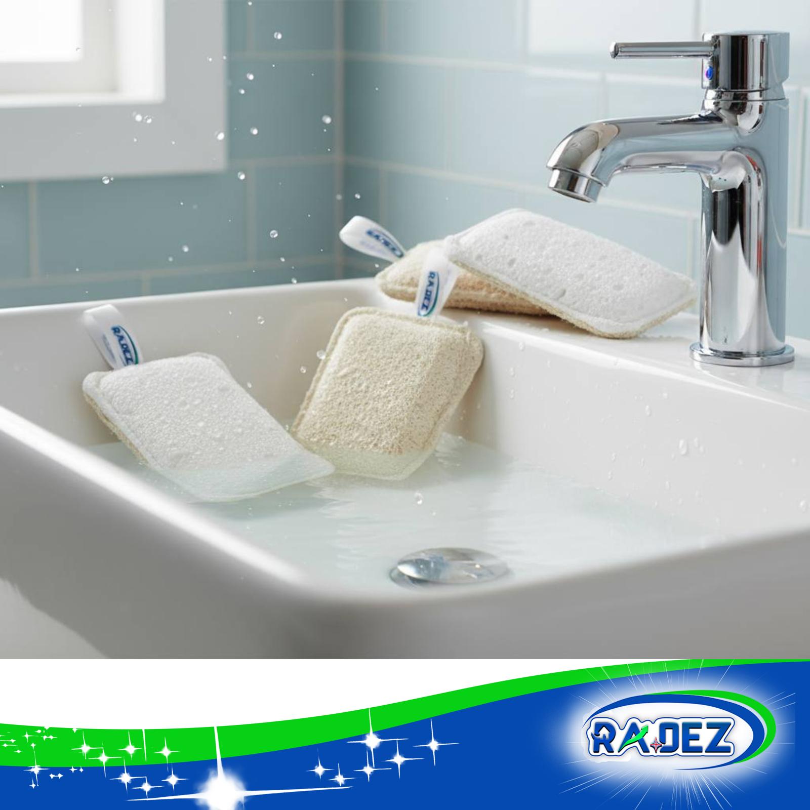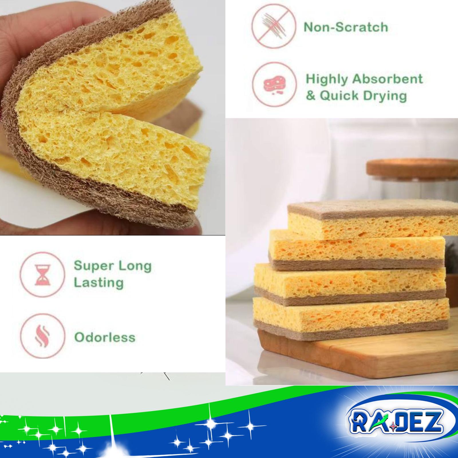 - Loofah Scourers: cellulose sponge + loofah scrub, cotton stitched